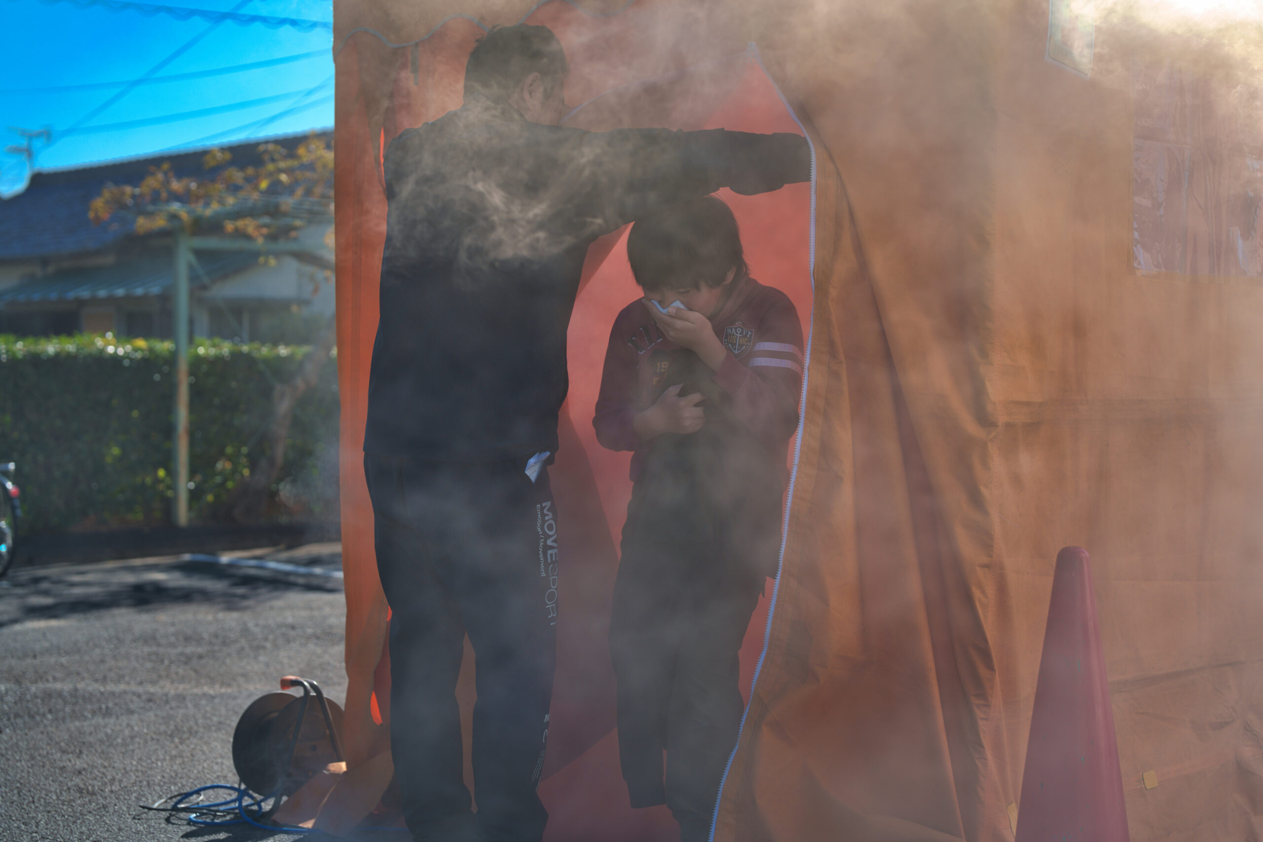 煙体験では、訓練用の煙が充満したスモークハウスで、視界が悪い中での移動を体験しました