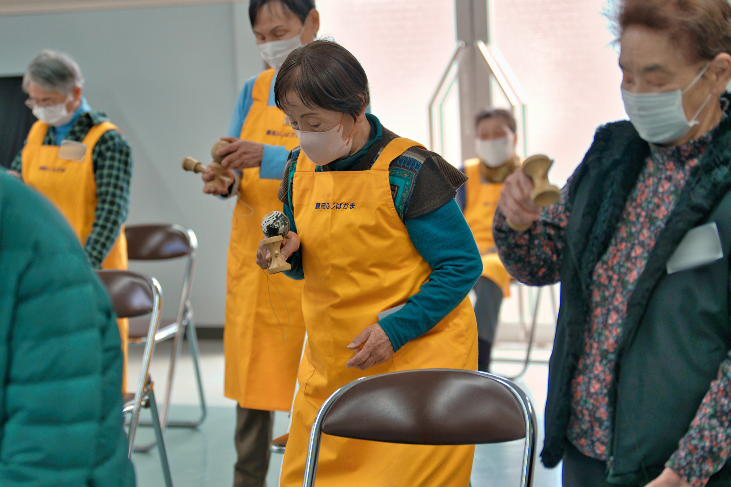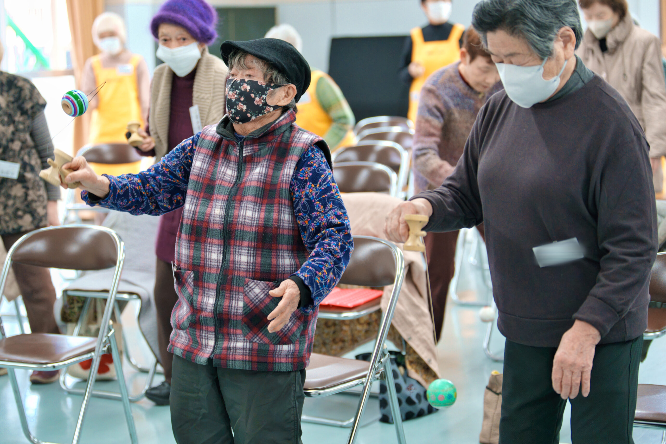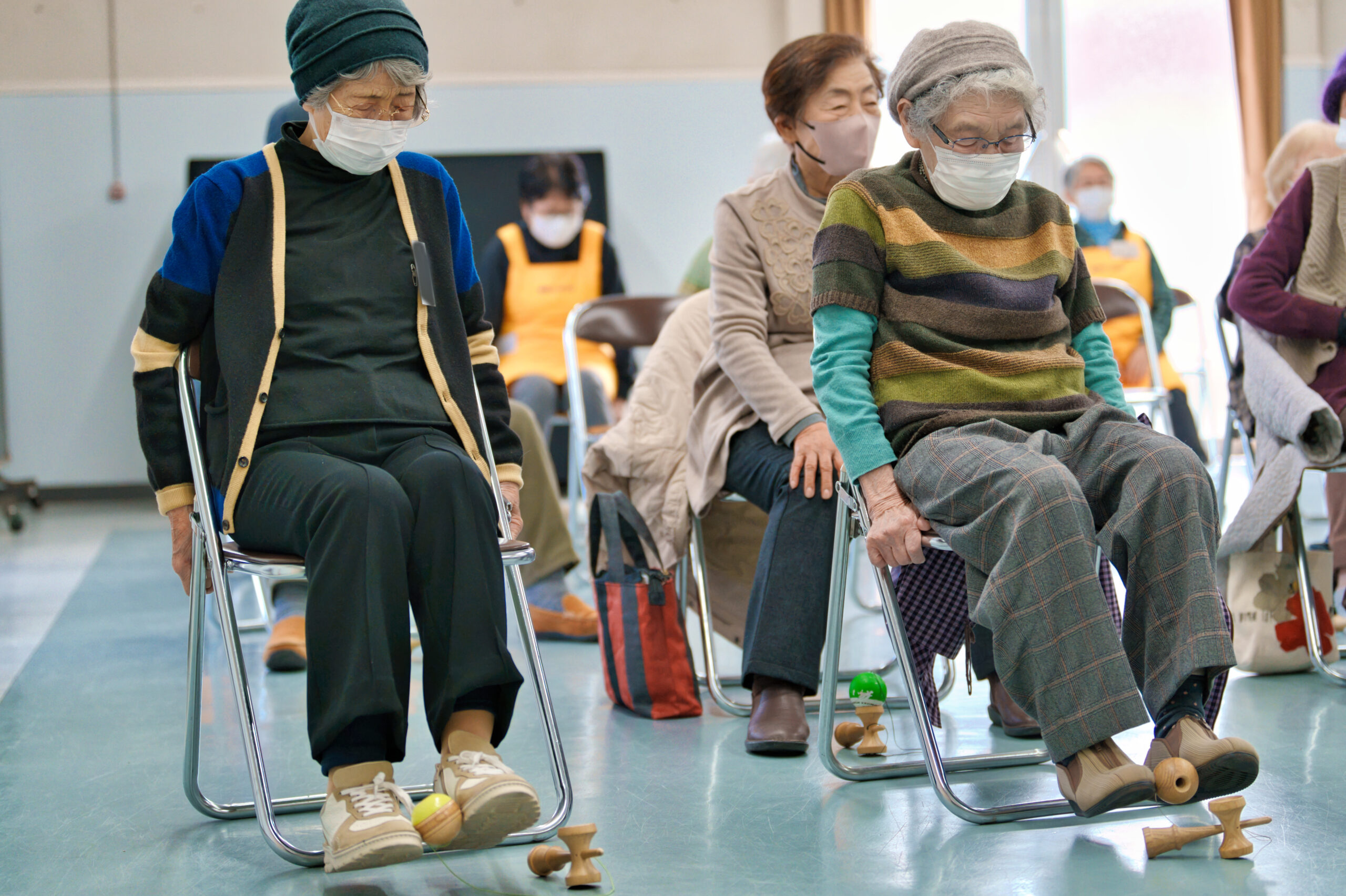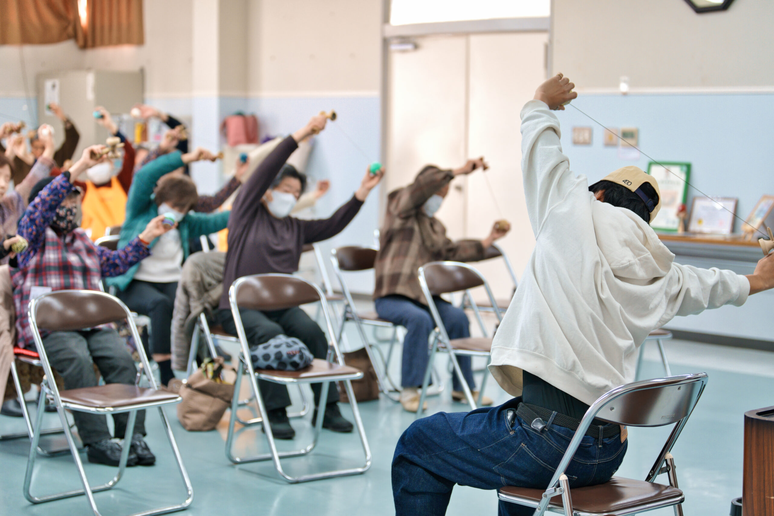 座ったままできるエクササイズとして、紐をまたぐ動作やけん玉を腕・膝・頭の周りで回すなど、普段使わない筋肉を使う動きも教わりました