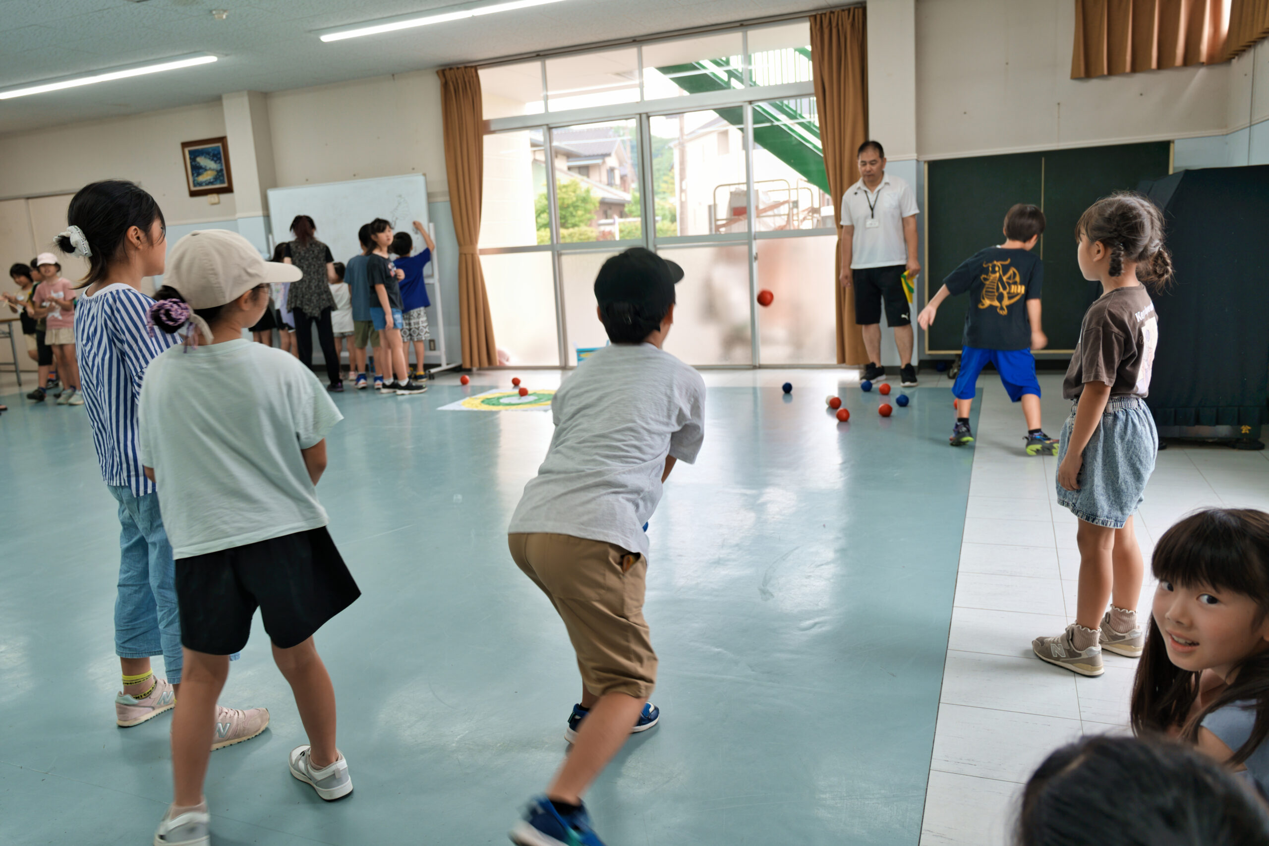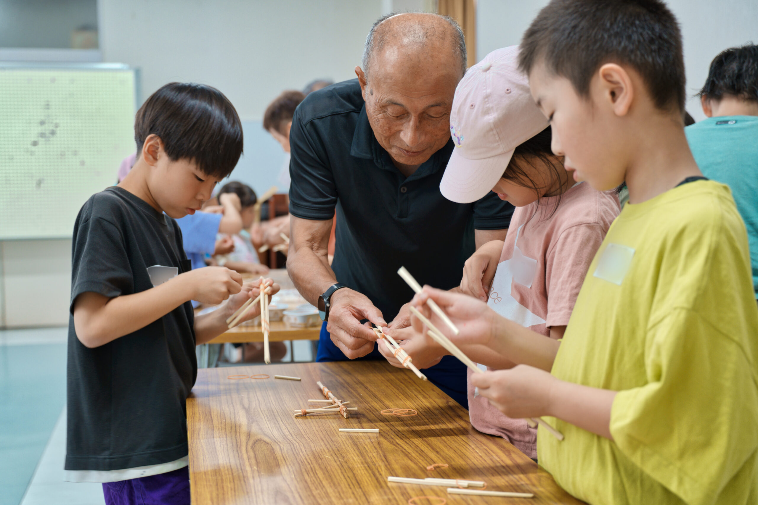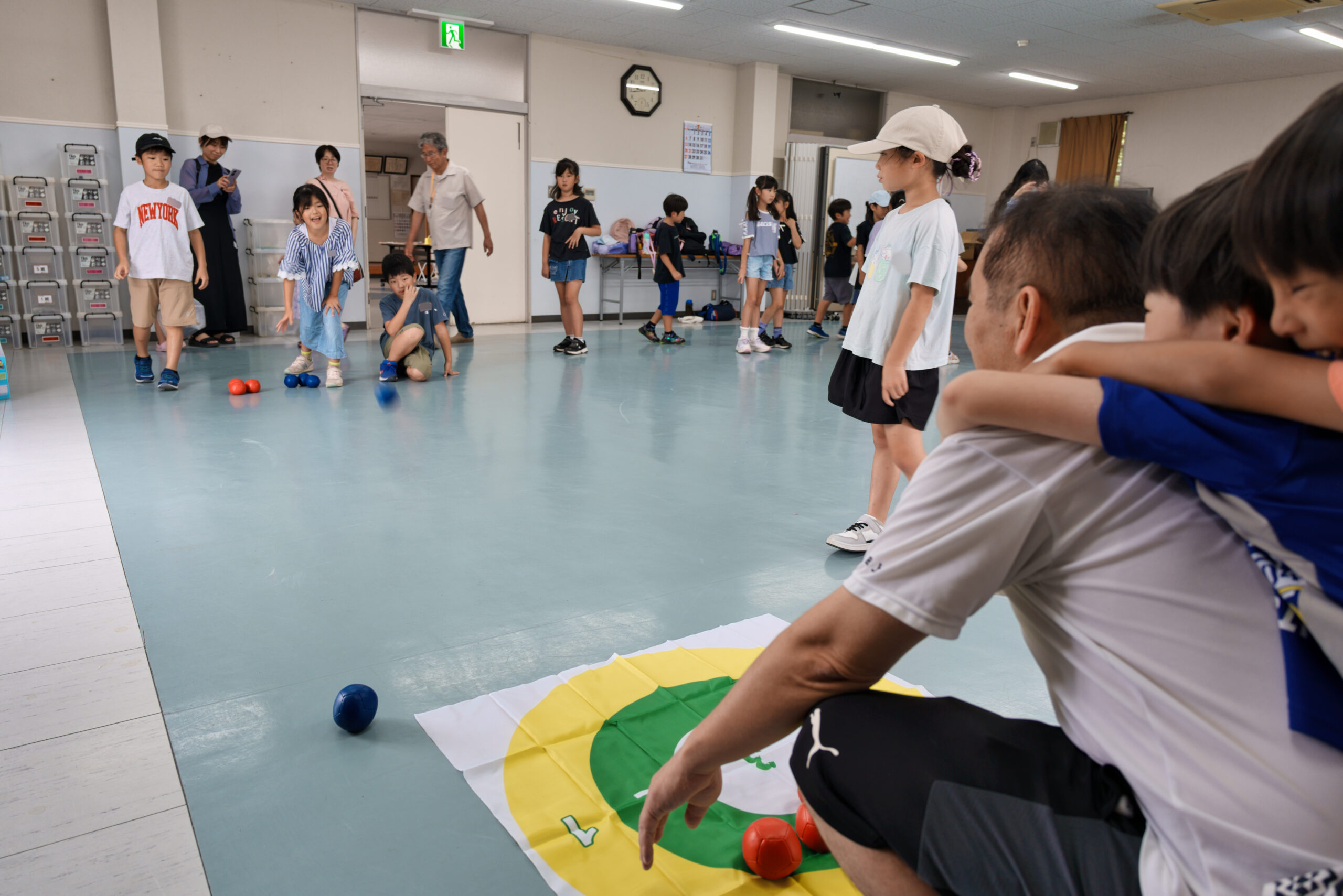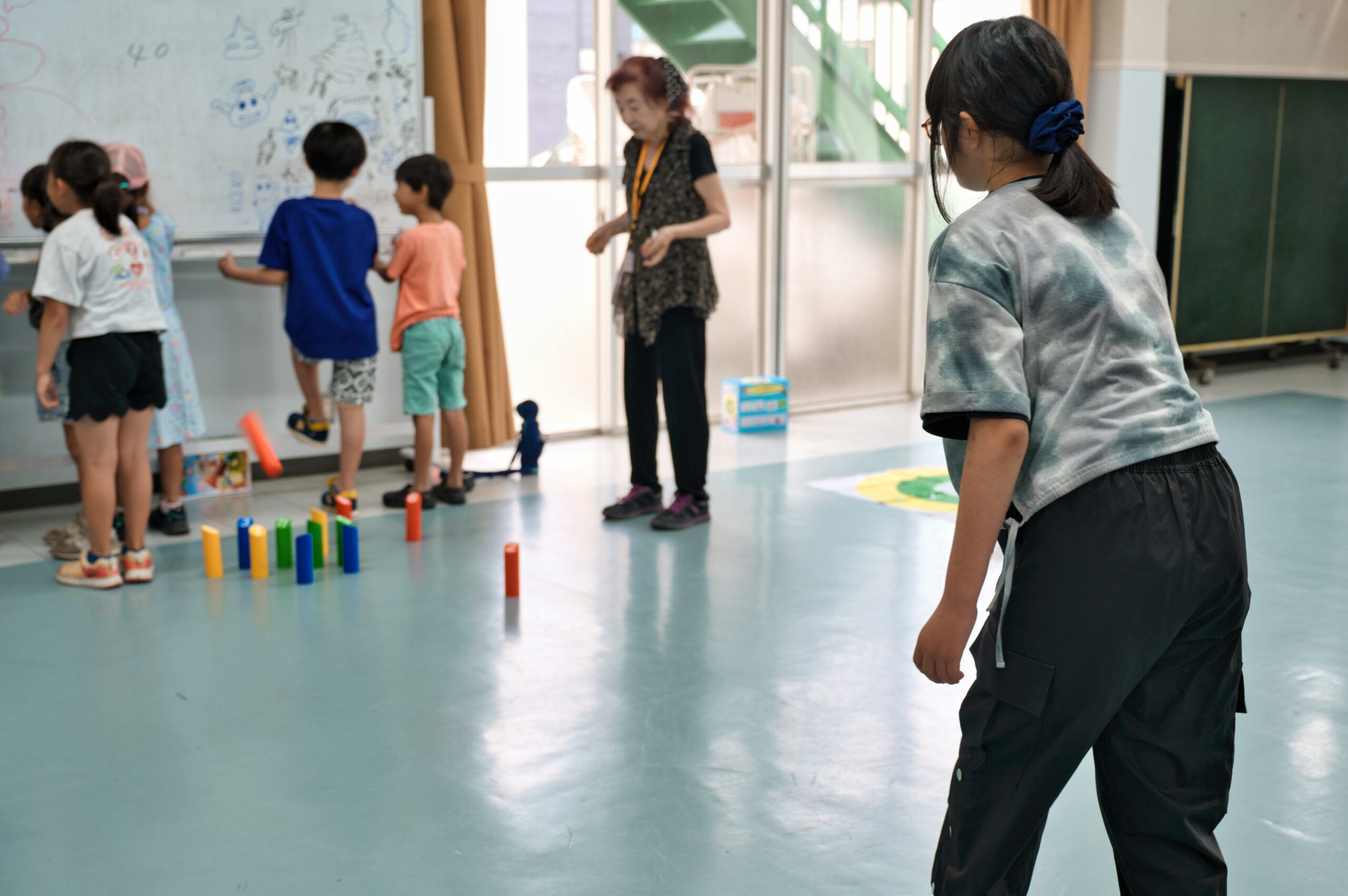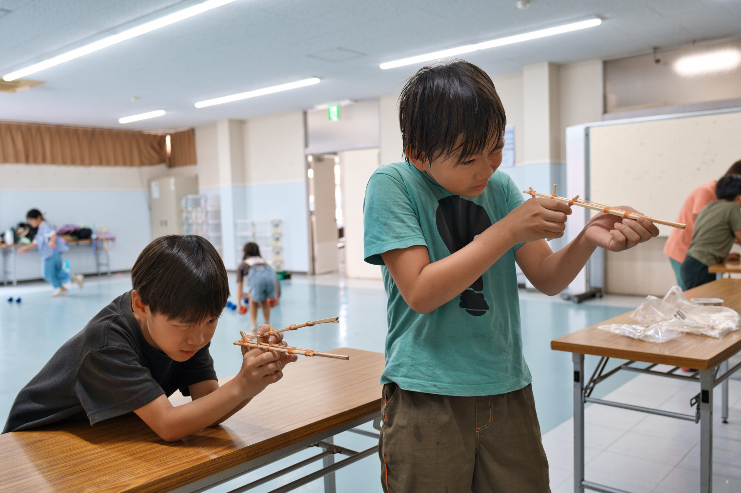 柔らかい素材でできたモルックやボッチャに挑戦したり、割りばし鉄砲を作ったりして、思い思いに過ごしていました