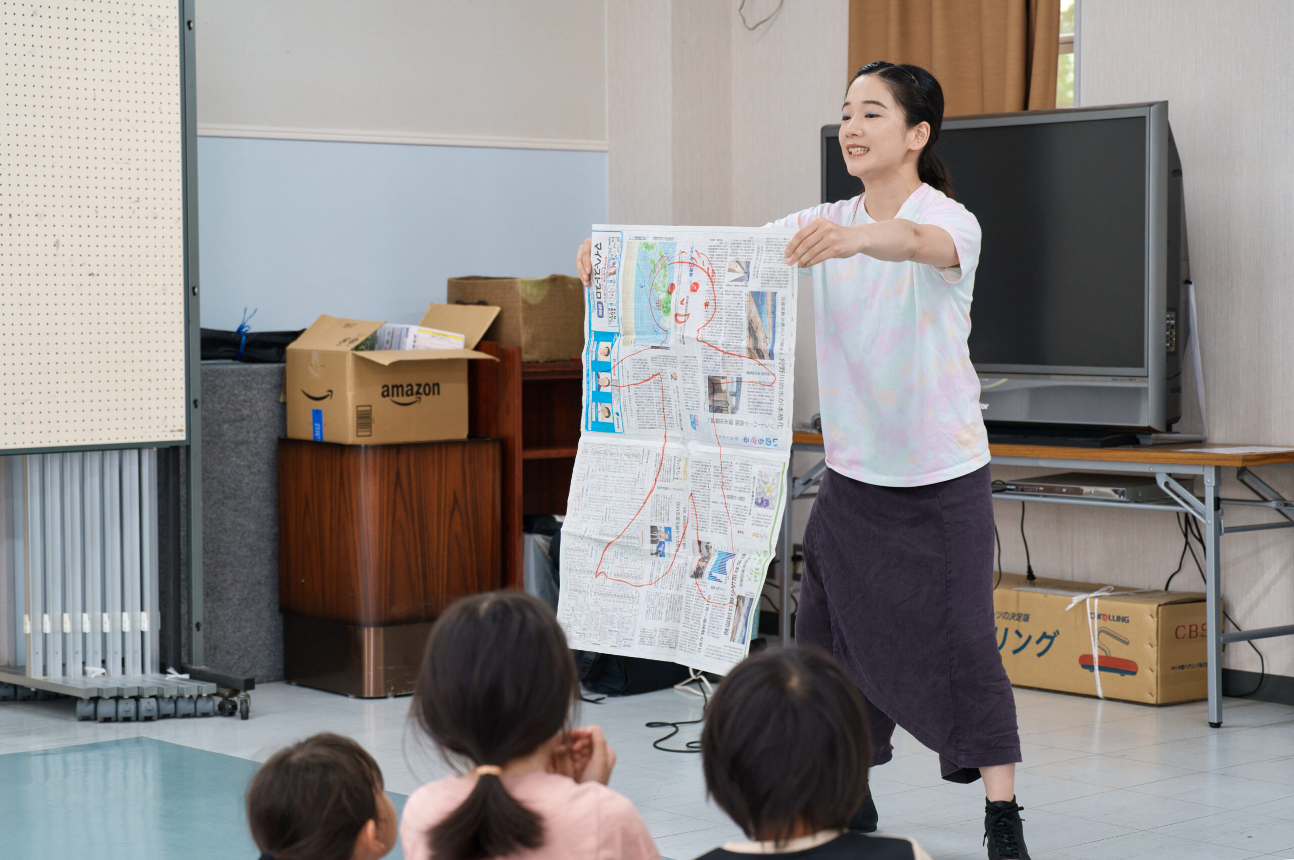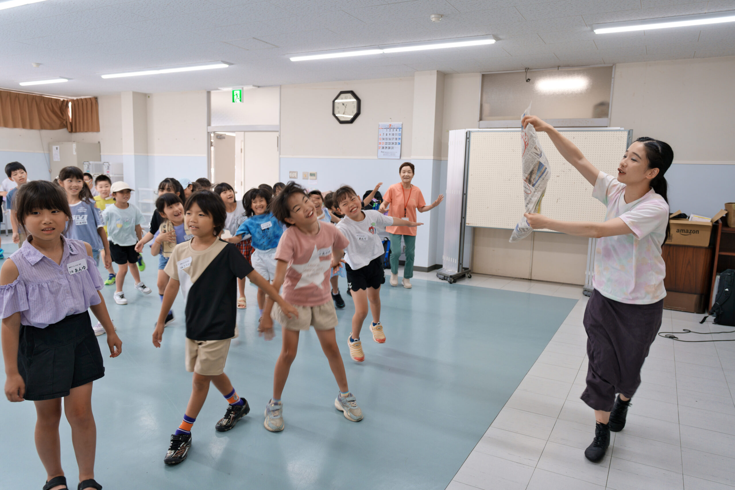 新聞紙を縦に折ったり横に動かしたり、くしゃくしゃに丸めたりすると、子どもたちもその動きを真似して、全身で表現していました