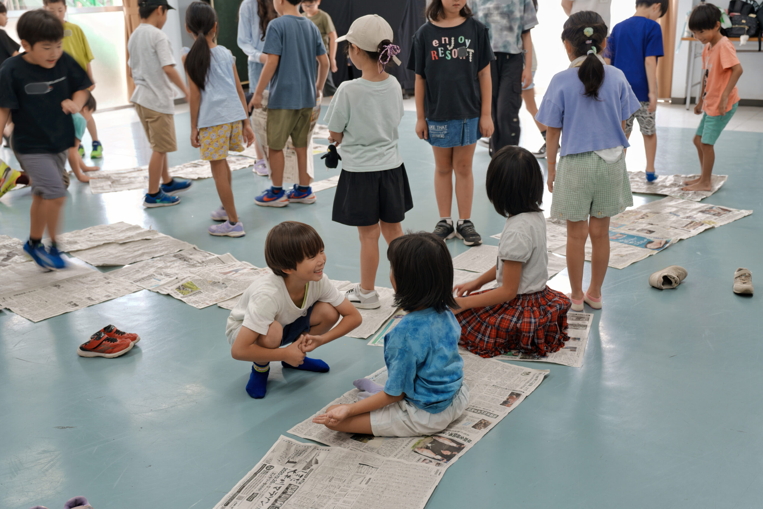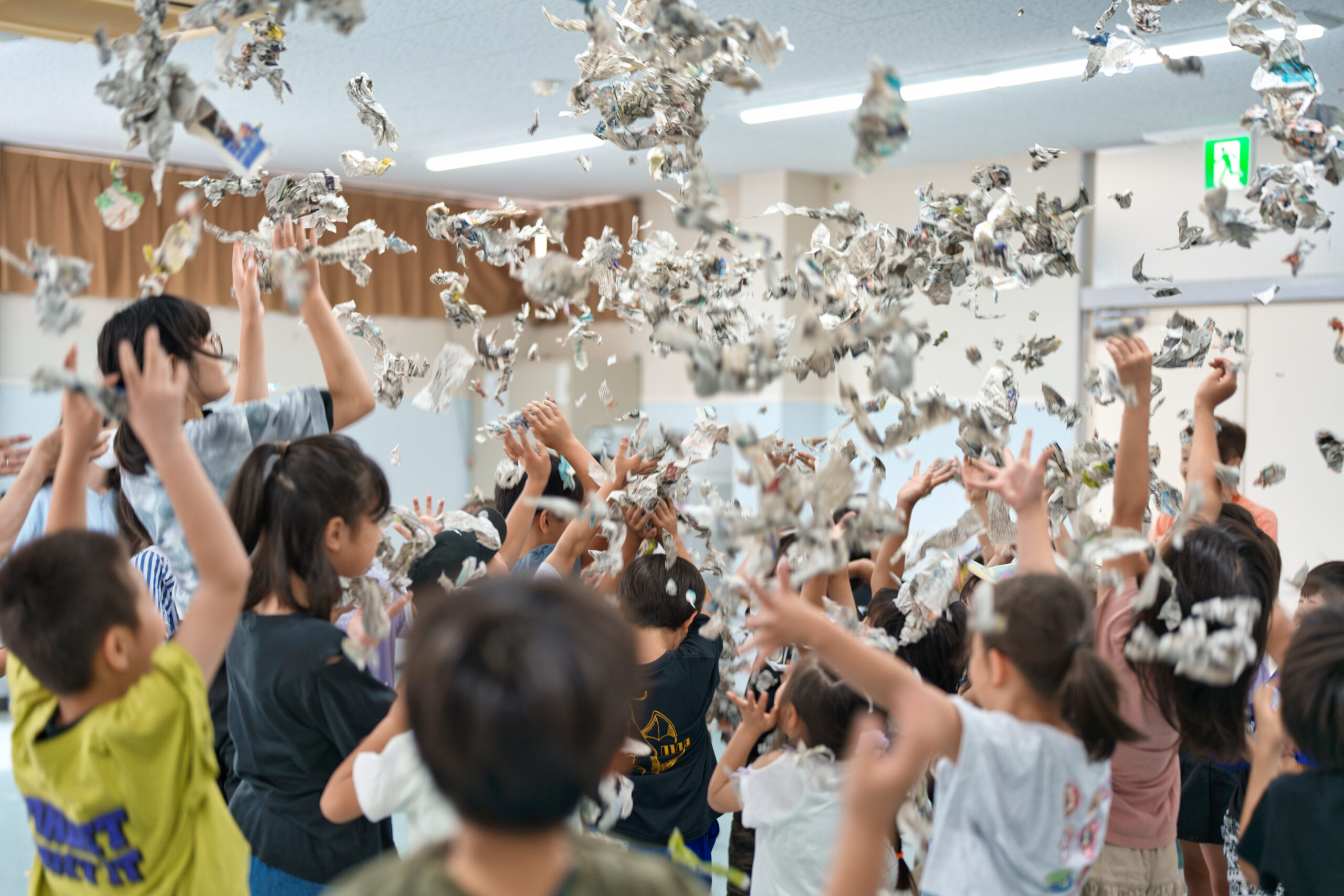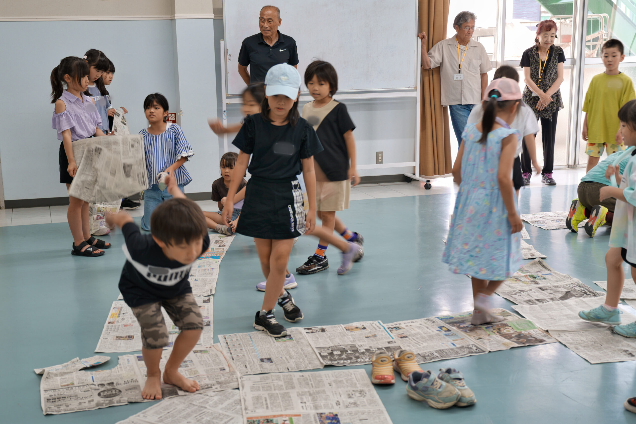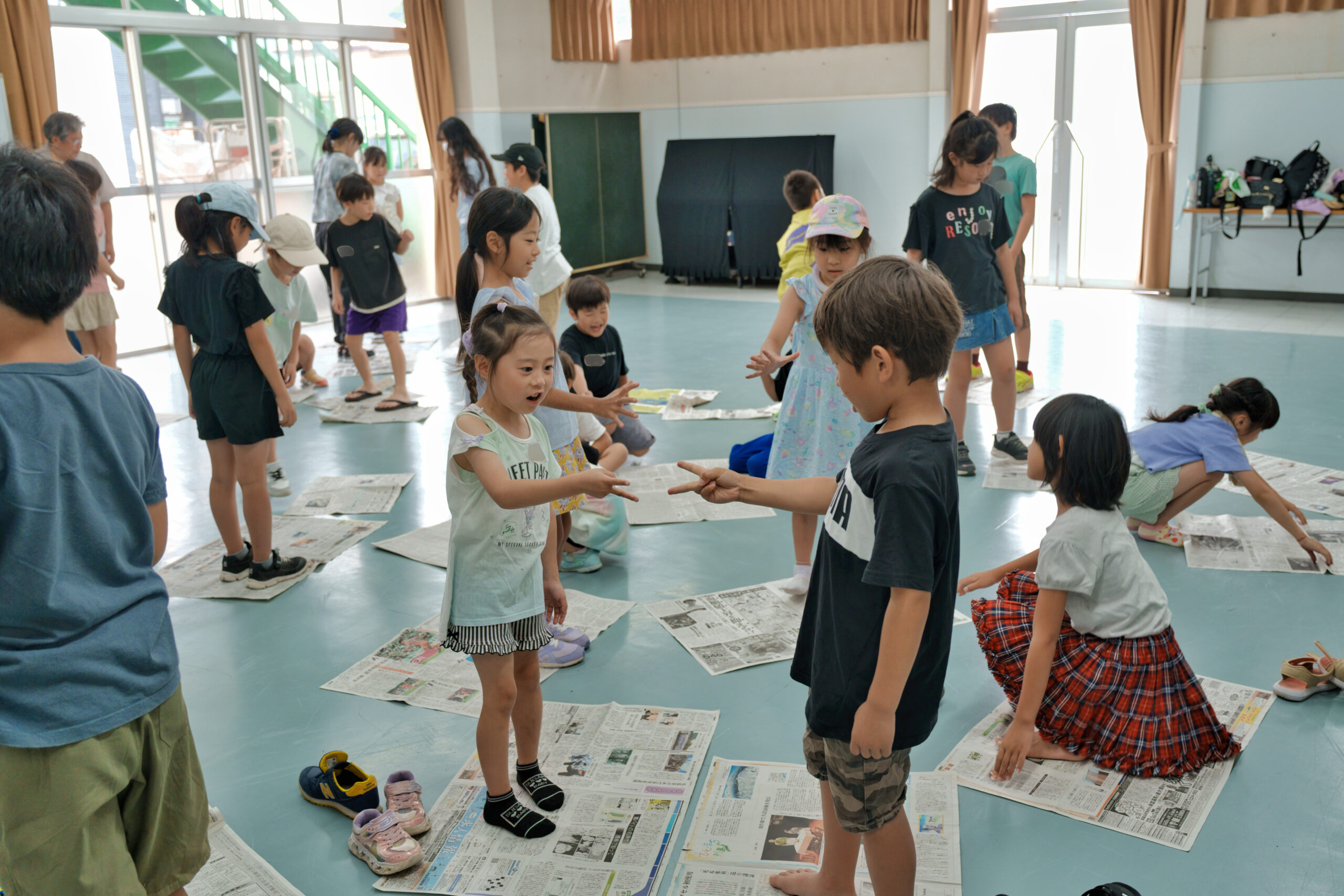 新聞紙を使った全身を使うあそびで、子どもたちは夢中になって取り組みました