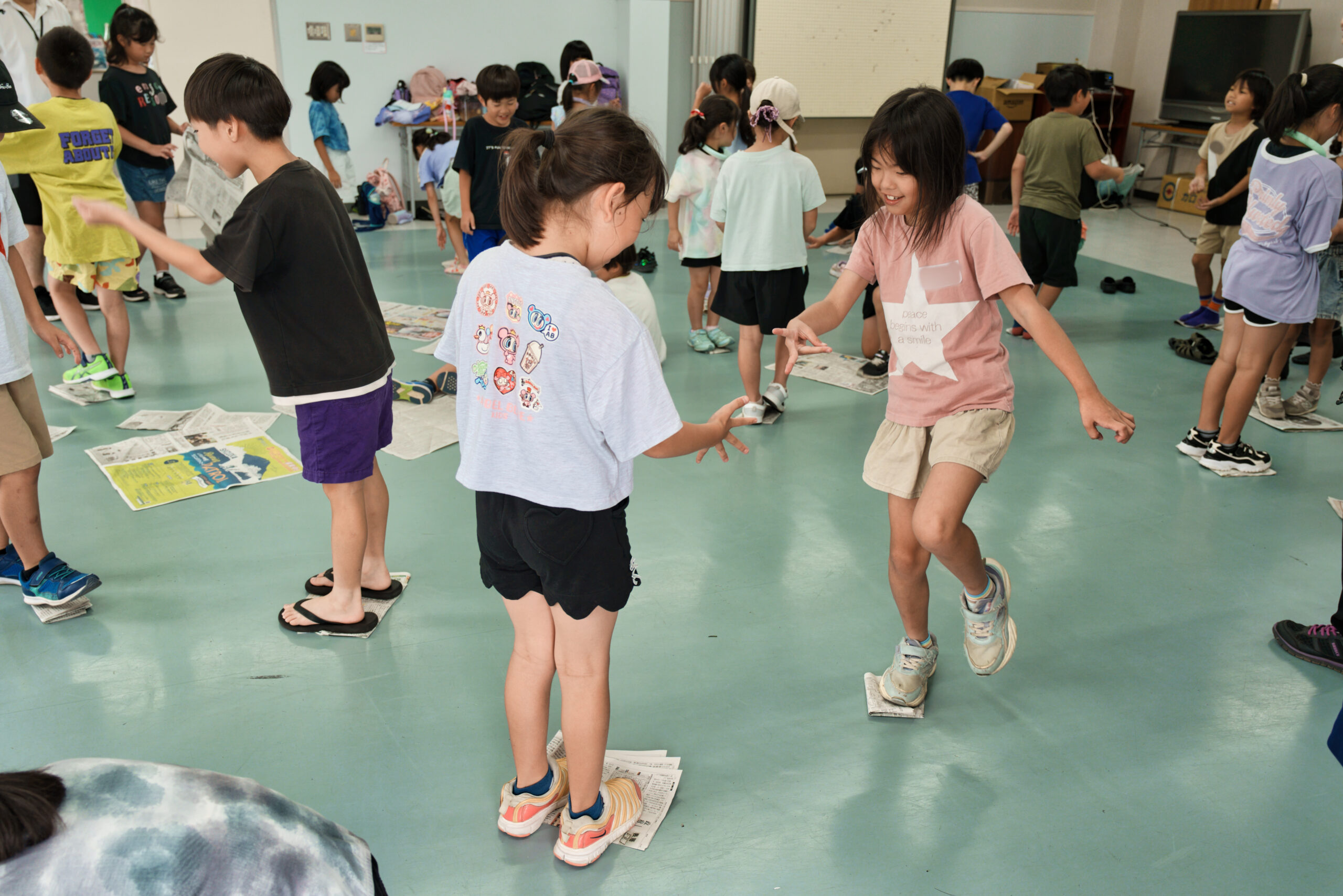 次に、新聞紙の上に乗ってじゃんけんを行い、負けたら新聞紙を半分に折るゲームをしました