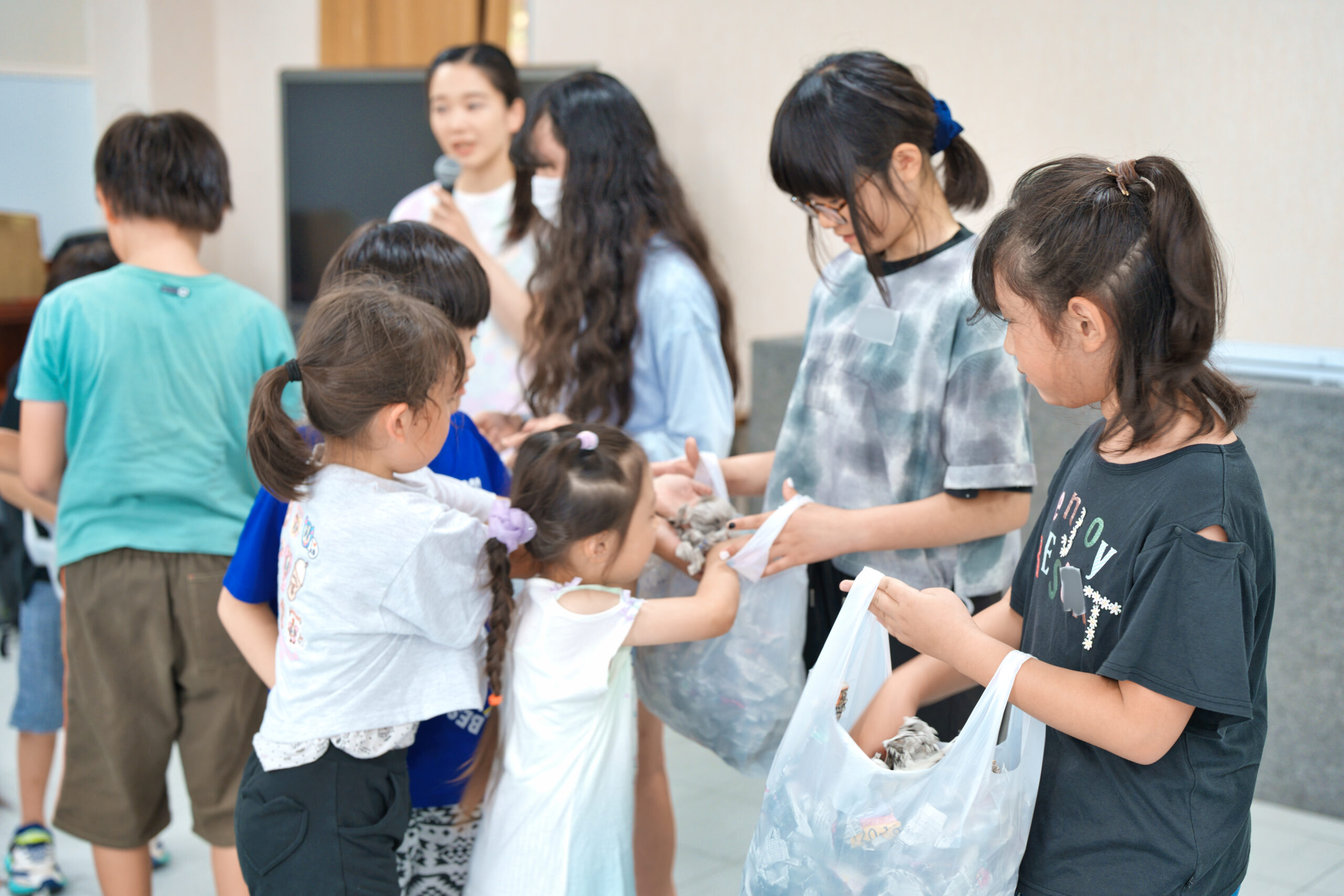 最後は、細かくなった新聞紙を袋に入れ、その袋を使ってのあそびです